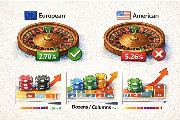 | Dozen / Column (12 numbers) | 2:1 | 12/37 | ~0.0270 | 12/38 | ~0.0526 |